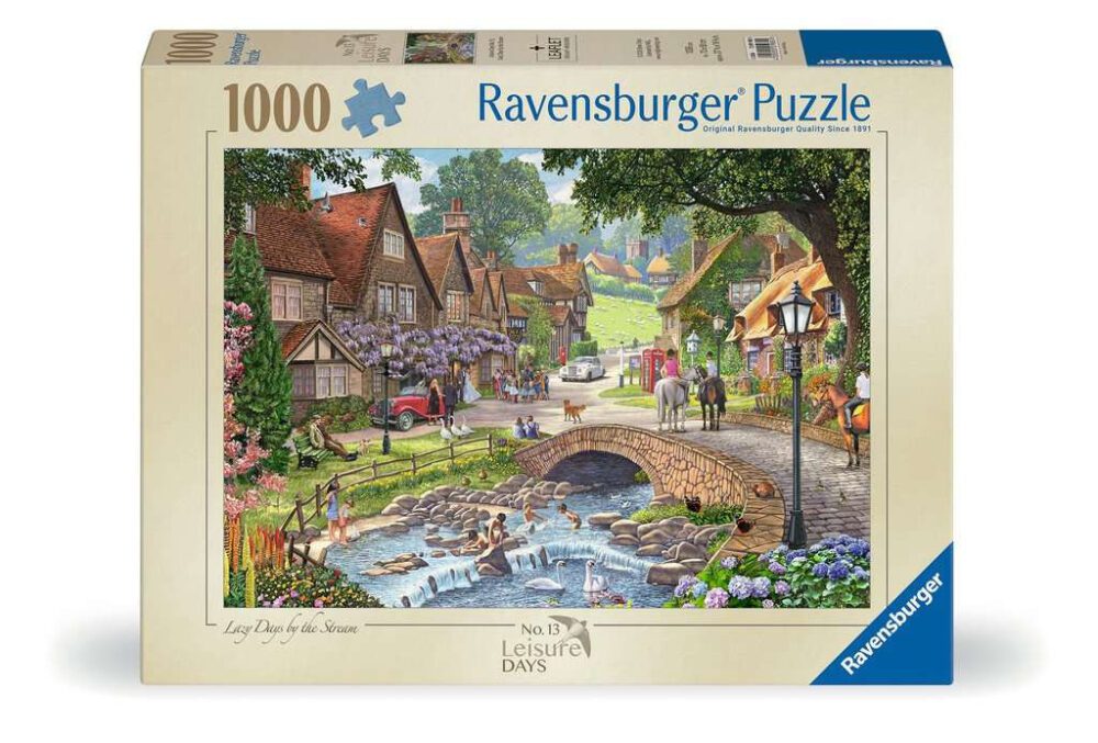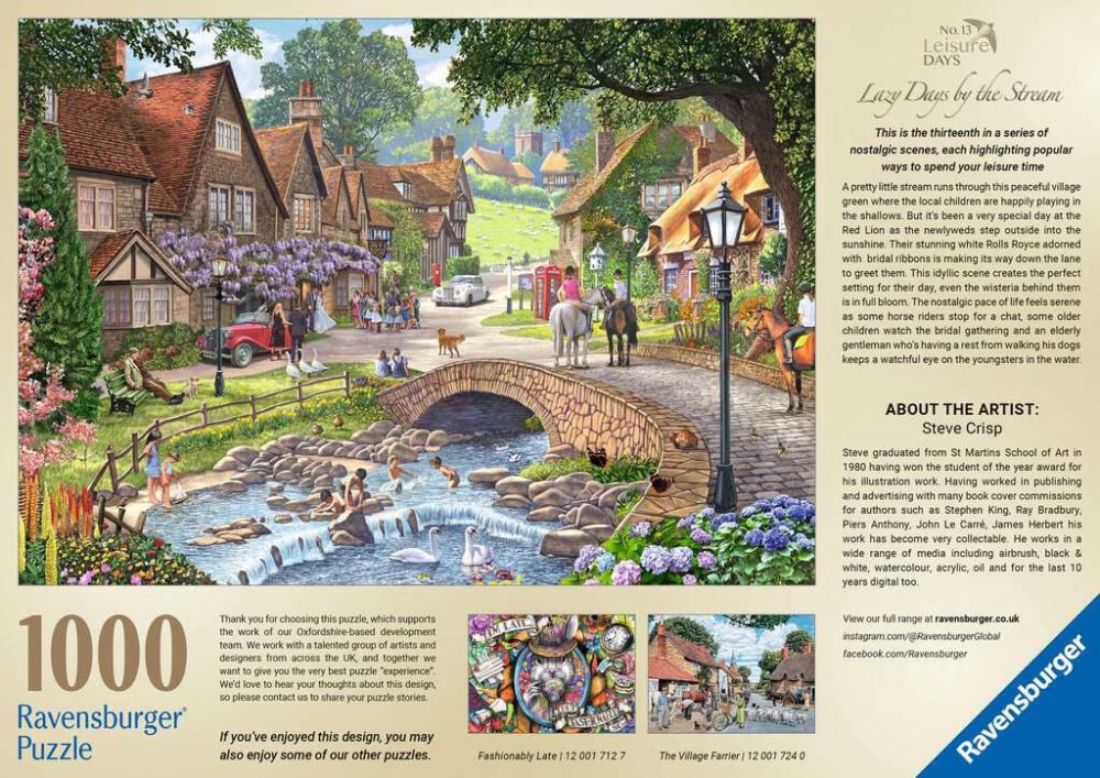 Step into the idyllic charm of countryside life with the Ravensburger 1000-piece jigsaw puzzle, Leisure Days No. 13 – Lazy Days by the Stream. Illustrated by renowned artist Steve Crisp, this puzzle captures the warmth and nostalgia of village life. The detailed artwork features children splashing in a gentle stream, a wedding party gathered outside a quaint country pub, and horses with riders enjoying the peaceful surroundings. Piece by piece, the lively, picturesque scene comes to life, offering puzzlers both a rewarding challenge and a touch of nostalgia. Once complete, it celebrates the joy and leisure of a perfect summer’s day in the countryside. Our 1000 piece jigsaws are crafted with premium quality materials and measure 70 x 50cm when complete. Great for Adults and ideal puzzles for Children 12 years old and up. Fully complies with all necessary UK and EU testing standards. Bestselling puzzle brand worldwide – With over 1 billion puzzles sold, our jigsaw puzzles make ideal gifts for women, great gifts for men and fit perfectly on our puzzle board. Our puzzles use an exclusive, extra-thick cardboard combined with our fine, linen structured paper to create a glare-free puzzle image and give you the best experience possible. #Positivelypuzzling – From fun family times together to long term health benefits and day-to-day mindful moments, there are so many positives about the humble Jigsaw! They make a great birthday gift or smashing Christmas gift